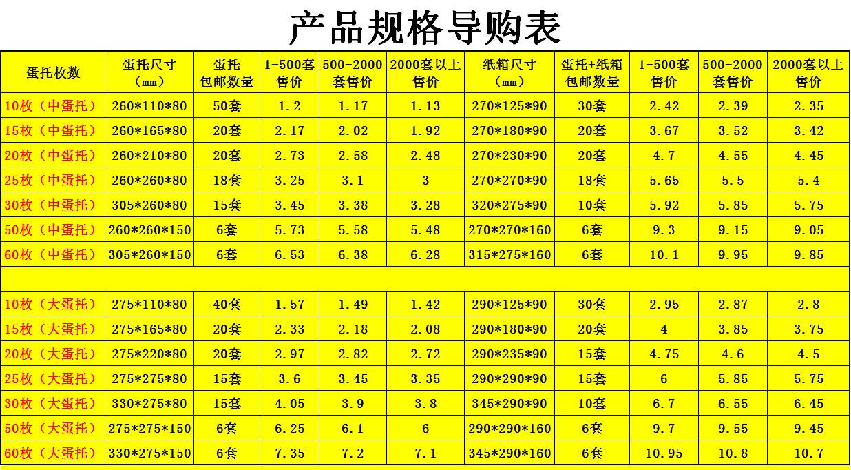 珍珠棉蛋托可以生產(chǎn)加工成什么類(lèi)型的呢?要滿(mǎn)足雞蛋的長(zhǎng)途運(yùn)輸,對(duì)珍珠棉蛋托的生產(chǎn)要求也是挺高的。下面一組數(shù)據(jù)是我廠(chǎng)為各養(yǎng)雞、養(yǎng)鴨廠(chǎng)制定的大小尺寸。